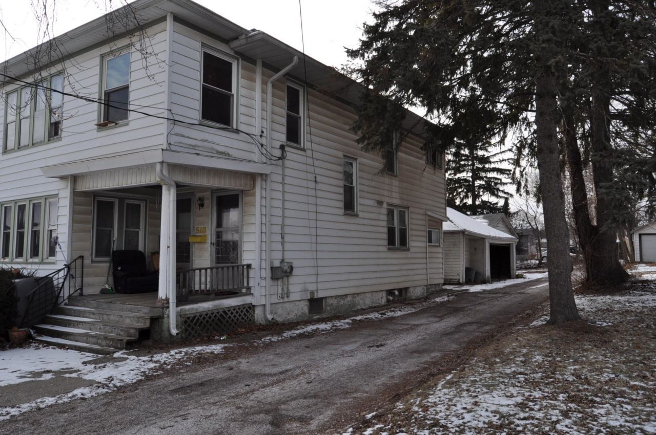 This is a large 2 story home with 4 + bedrooms,2 baths and 2 stall garages on alley and shared driveway with one car garage on Brick Street on south side of house. Could be easily turned back into a duplex but is now set up as a single-family home.